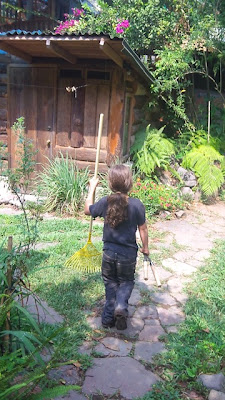 There's more time for outdoors work too. Here Lu is practicing his machete skills and cutting down the brush on an undeveloped part of our yard. Where we live, boys will start learning how to use a machete at age 6.