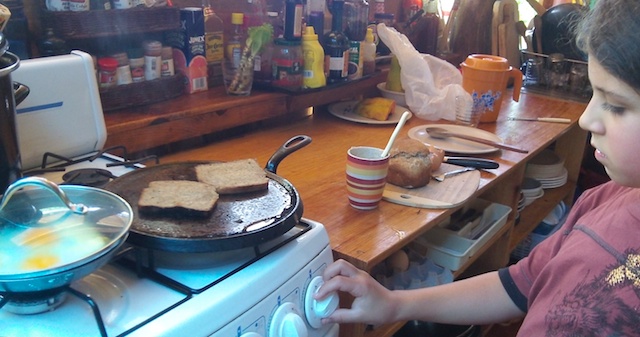It's nice to see him so independent in the kitchen. It's one of those skills that puts part of a mother's mind at ease - I know he can cook for himself - at least eggs, rice, and griddled vegetables.